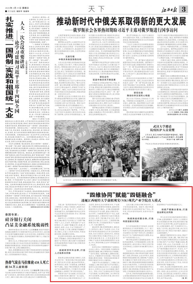 3月19日,江西日报03版发表《“四维协同”赋能“四链融合”》,文章详细报道了我校建设虚拟现实(VR)现代产业日本无码 育人模式创新与实践。