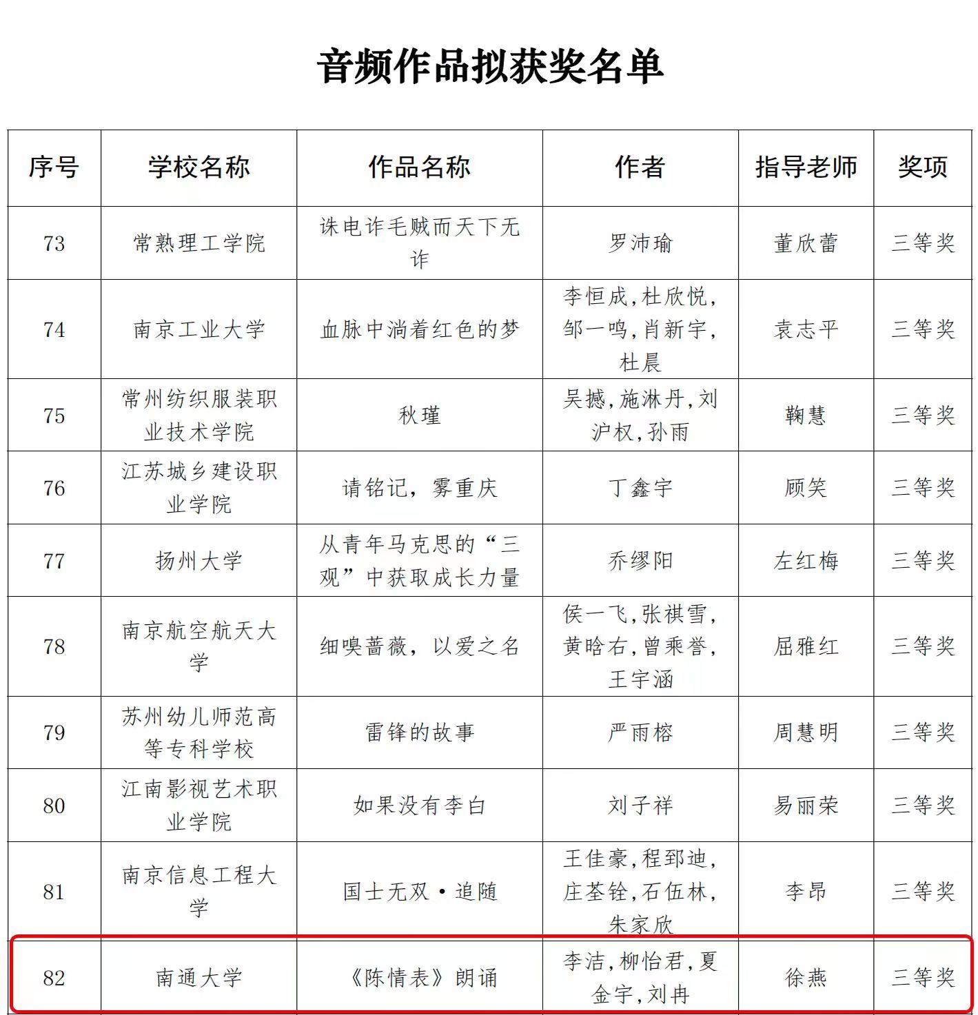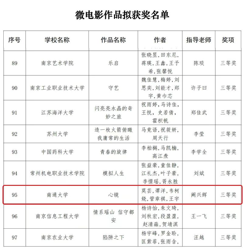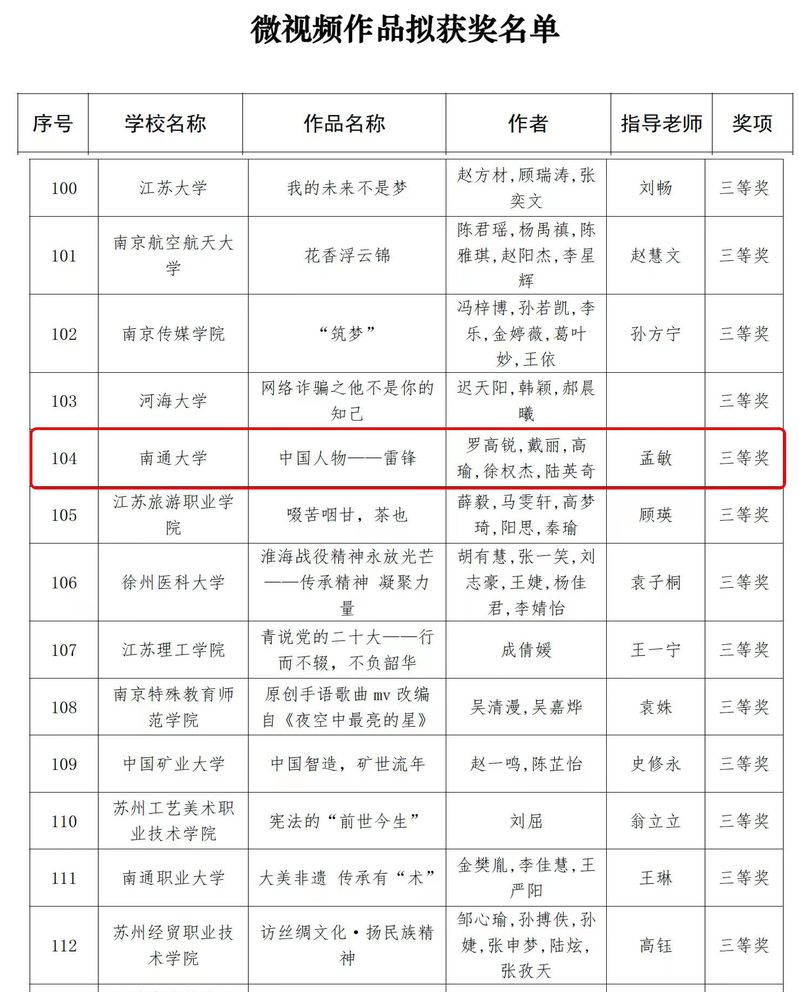 近日,江苏省委教育工委、江苏省教育厅公布了2023年江苏省大学生网络文化节和高校网络教育优秀作品推选展示活动遴选结果。经过高校申报、材料初审、专家评审,日本无码 共三项作品在江苏省大学生网络文化节中取得佳绩,微视频作品《中国人物—雷锋》荣获微视频类三等奖,微电影作品《心镜》荣获微电影类三等奖,音频作品《陈情表》荣获音频作品类三等奖。