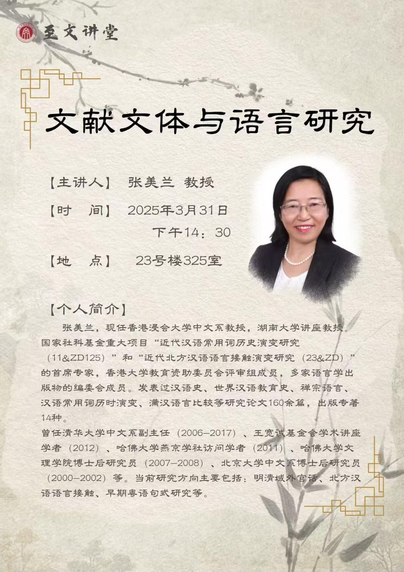 嘉宾简介:张美兰,江苏南通人,现任香港浸会大学中文系教授,湖南大学讲座教授。国家社科基金重大项目“近代汉语常用词历史演变研究(11&ZD125)”和“近代北方汉语语言接触演变研究(23&ZD)”的首席专家,香港大学教育资助委员会评审组成员,多家语言学出版物的编委会成员。发表过汉语史、世界汉语教育史、禅宗语言、汉语常用词历时演变、满汉语言比较等研究论文160余篇,出版专著14种。